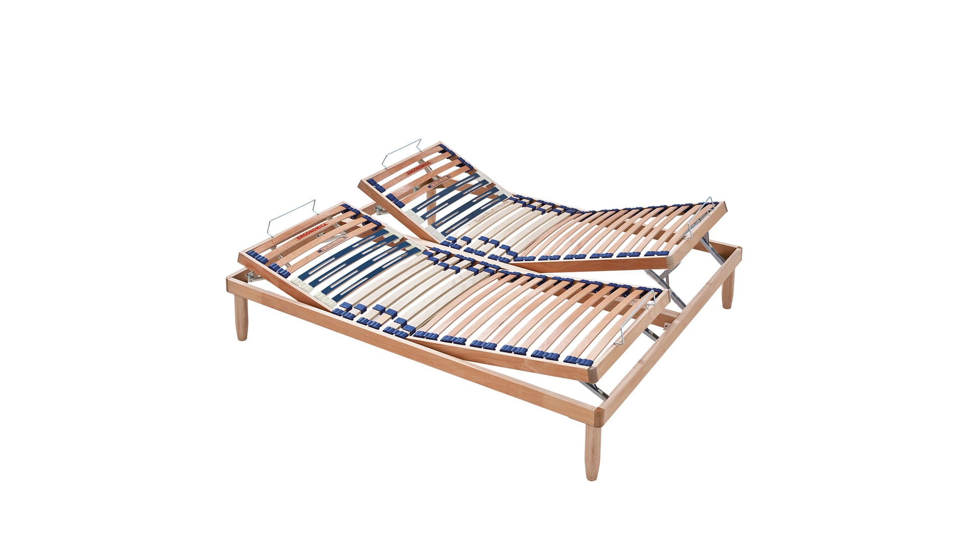 Somier extraplano, con soporte de láminas basculantes sujetos en la parte interior del marco. Láminas ranuradas en la zona de los hombros para garantizar la máxima transpiración en este espacio durante el sueño.